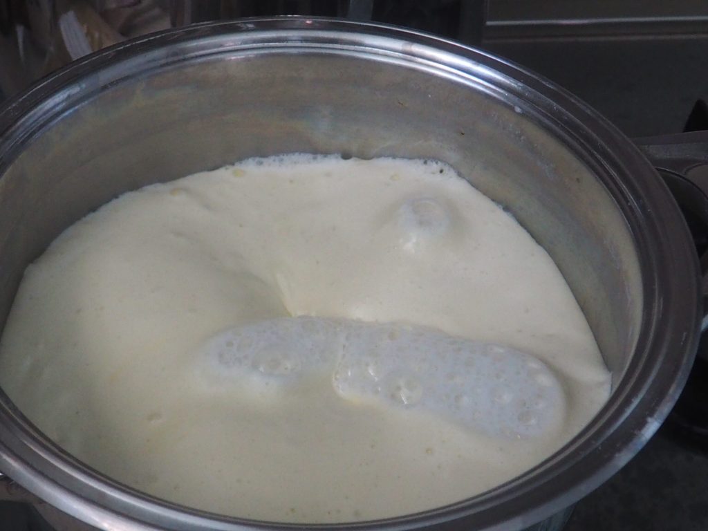 • Verwarm de melk in een vrij grote pan, vlak voordat het kookt, giet het eimengsel bij de melk en wacht tot het weer kookt. Je zult uitbarstingen zien zoals lavastromen van een vulkaan, nu roer met de garde totdat het ingedikt is, blijf doorgaan voor een paar minuten totdat je een glad mengsel hebt.