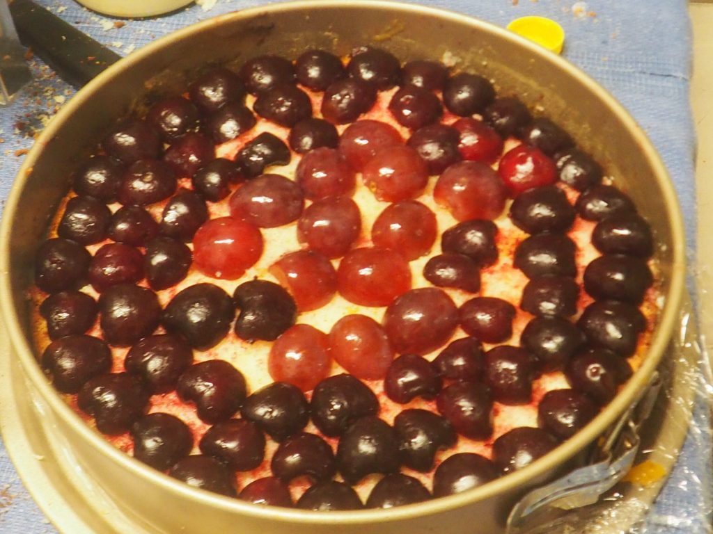• Neem de springvorm opnieuw en leg de eerste biscuitlaag erop, bedek deze met de ontpitte en gehalveerde kersen.