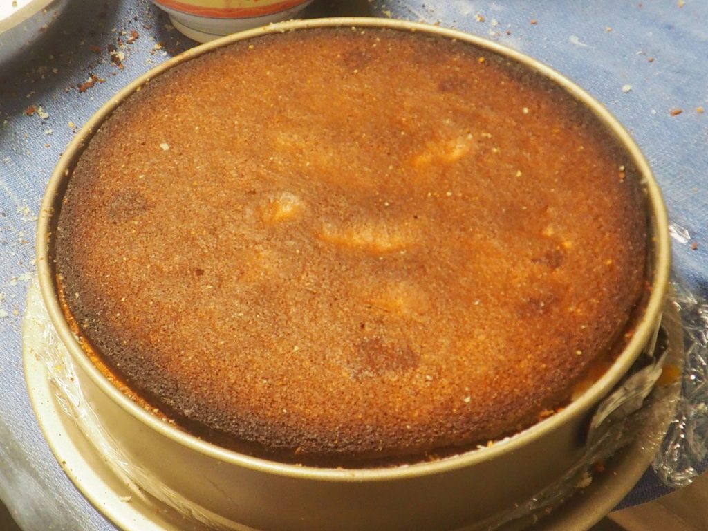 • Snijd intussen de biscuit in twee schijven van gelijke hoogte, verwijder indien mogelijk de bovenste en onderste lagen die anders te hard zouden zijn. Plaats de eerste schijf op een bord en besprenkel zowel de bovenkant als de onderkant met de helft van de siroop. Ik gebruikte een keukenkwast, maar je kunt ook een flesje met een geperforeerde dop of een theelepel gebruiken.