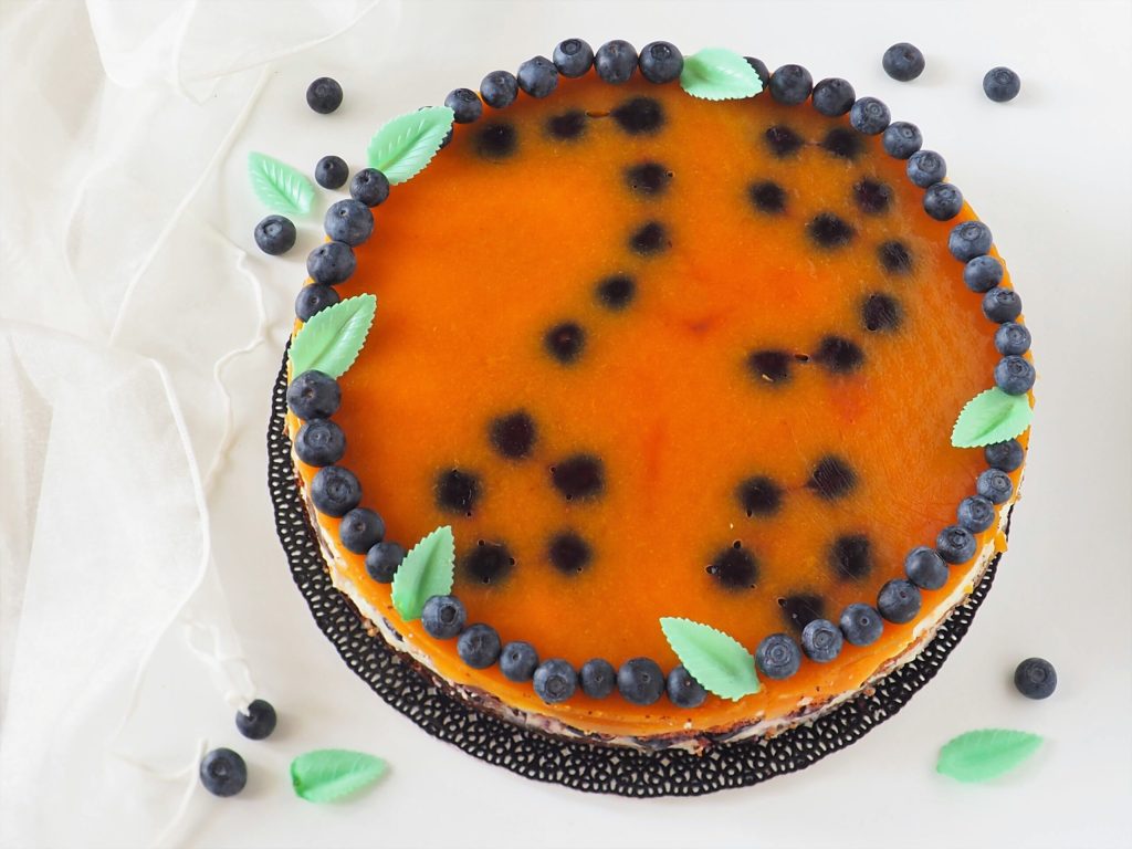 Omgekeerde cheesecake met banketbakkersroom, kersen en perzikgelei