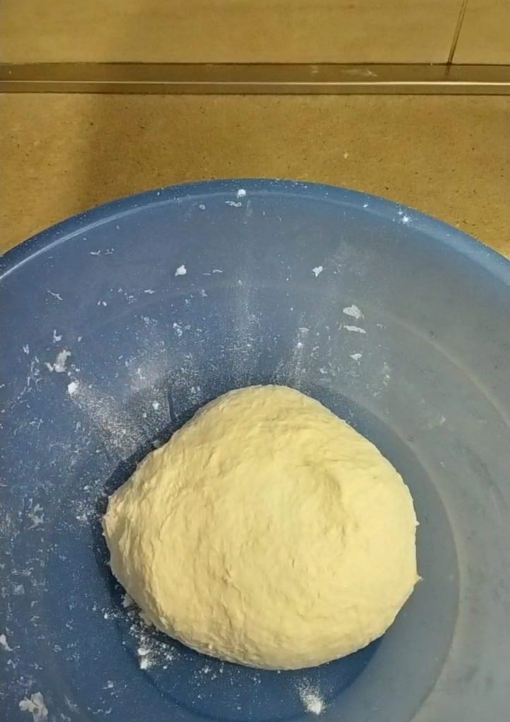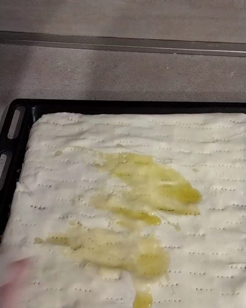 Zodra het gerezen is, spreid het deeg uit op de met boter ingevette bakplaat, olie het oppervlak, bedek met plasticfolie en laat weer enkele uren rijzen.