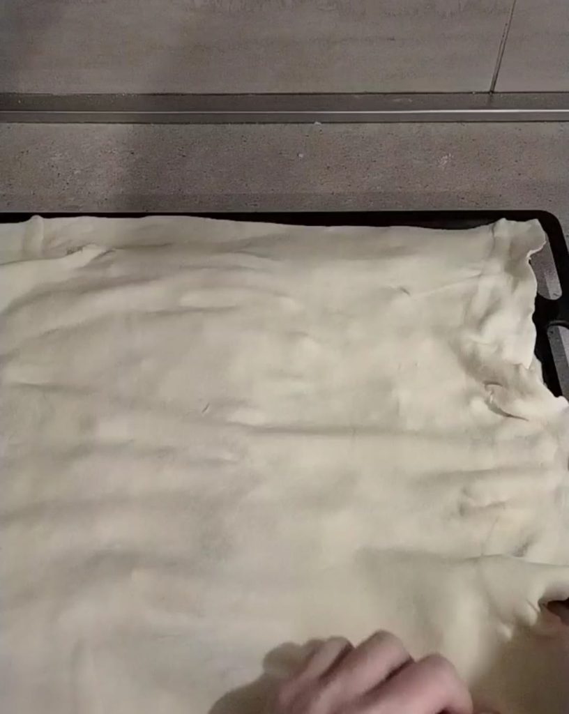 Plaats het bladerdeeg er bovenop, na het iets uitgerekt te hebben met de handen of een deegroller, zodat het de hele oppervlakte van de bakplaat goed bedekt. Zorg ervoor dat het goed aan de randen hecht en probeer de hele omtrek goed af te sluiten.