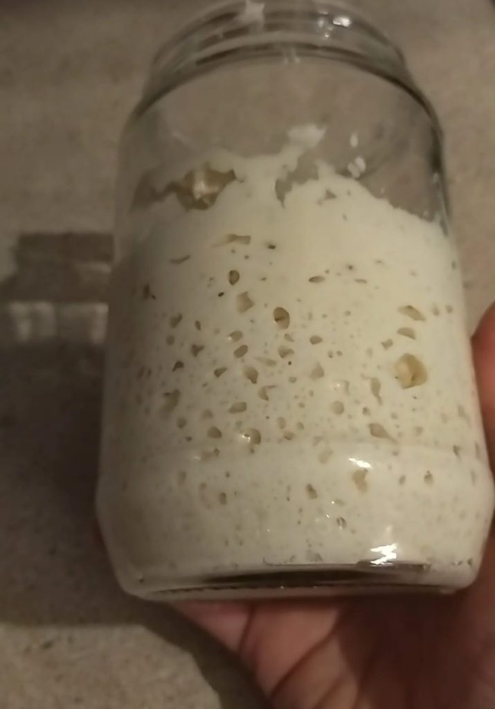 Voor dit recept heb ik moedergist gebruikt, maar als je dat niet hebt, kun je biergist gebruiken. In dat geval moet je de giststarter maken door 50 ml. warm water uit het totaal te nemen, de gist te verkruimelen, de suiker toe te voegen en twee eetlepels bloem, ook uit het totaal. Roer en laat enkele minuten staan tot de gist is geactiveerd.