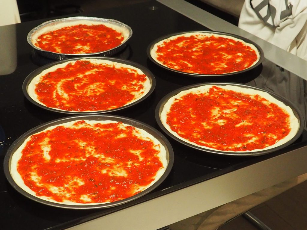 Doe ongeveer 4 eetlepels passata op elke pizza, laat het nog ongeveer een half uur rijzen.