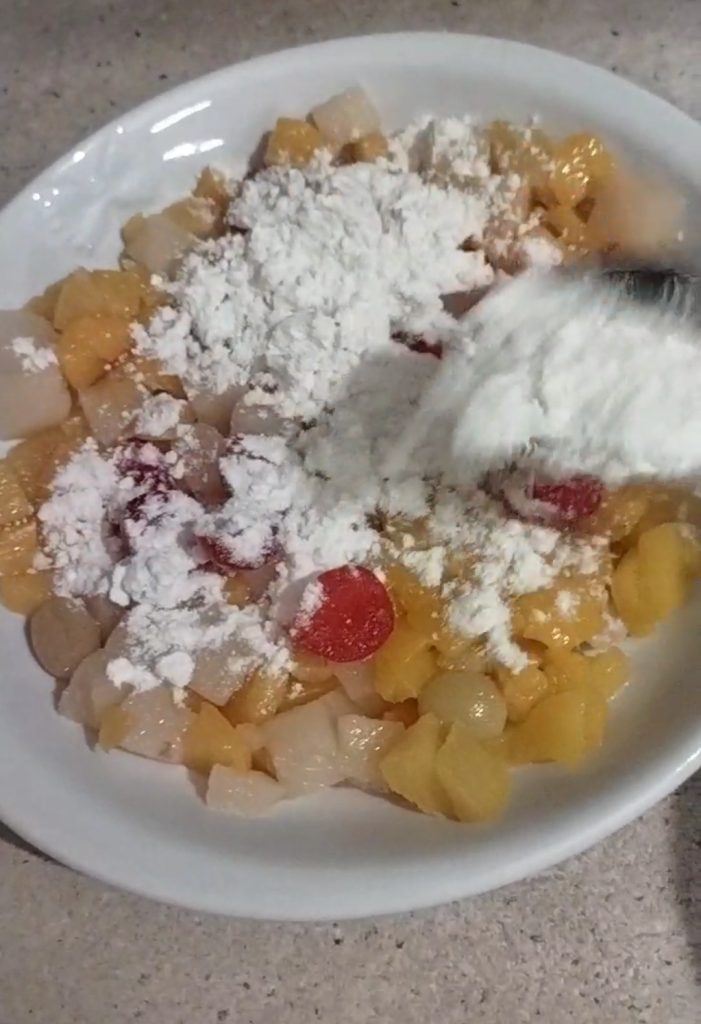 - 250 g fruitsalade (van gesuikerd fruit, uitgelekt gewicht)