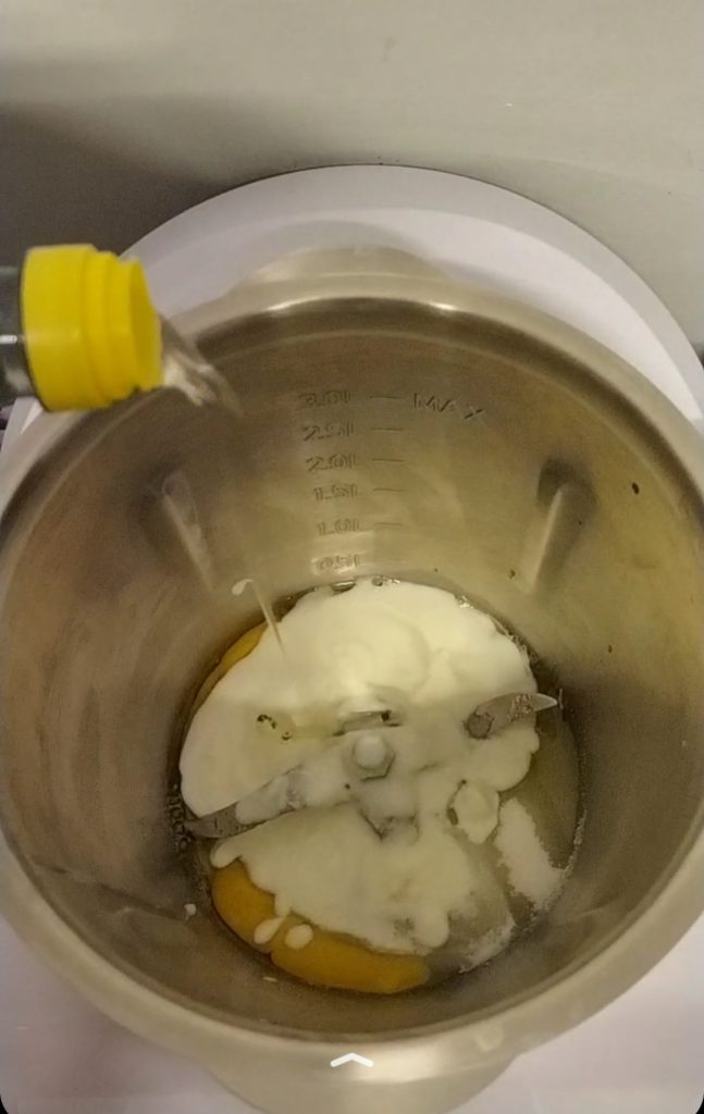 Doe de eieren, suiker, vanille-extract, yoghurt, olie in de kom van de keukenmachine en meng een paar seconden. Als alternatief voor de keukenmachine kunt u een kom en een garde gebruiken.