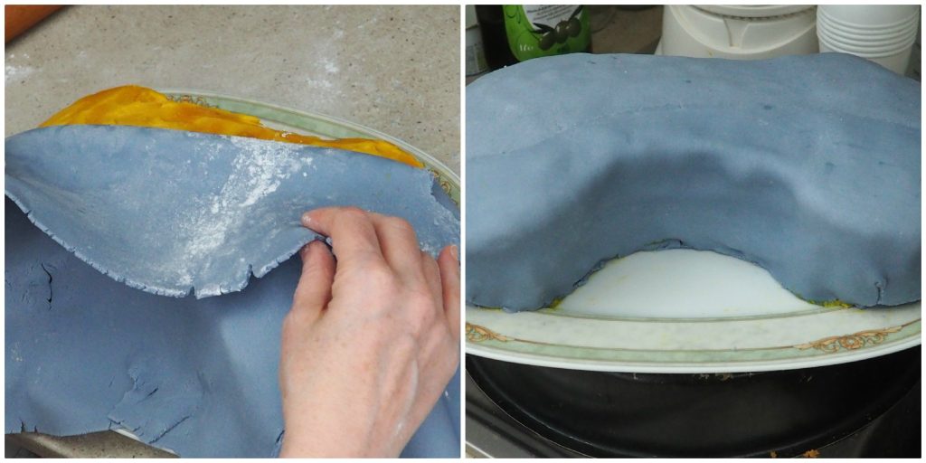 Bedek nu de hele taart met de suikerpasta, probeer het goed aan het oppervlak van de taart te laten hechten.