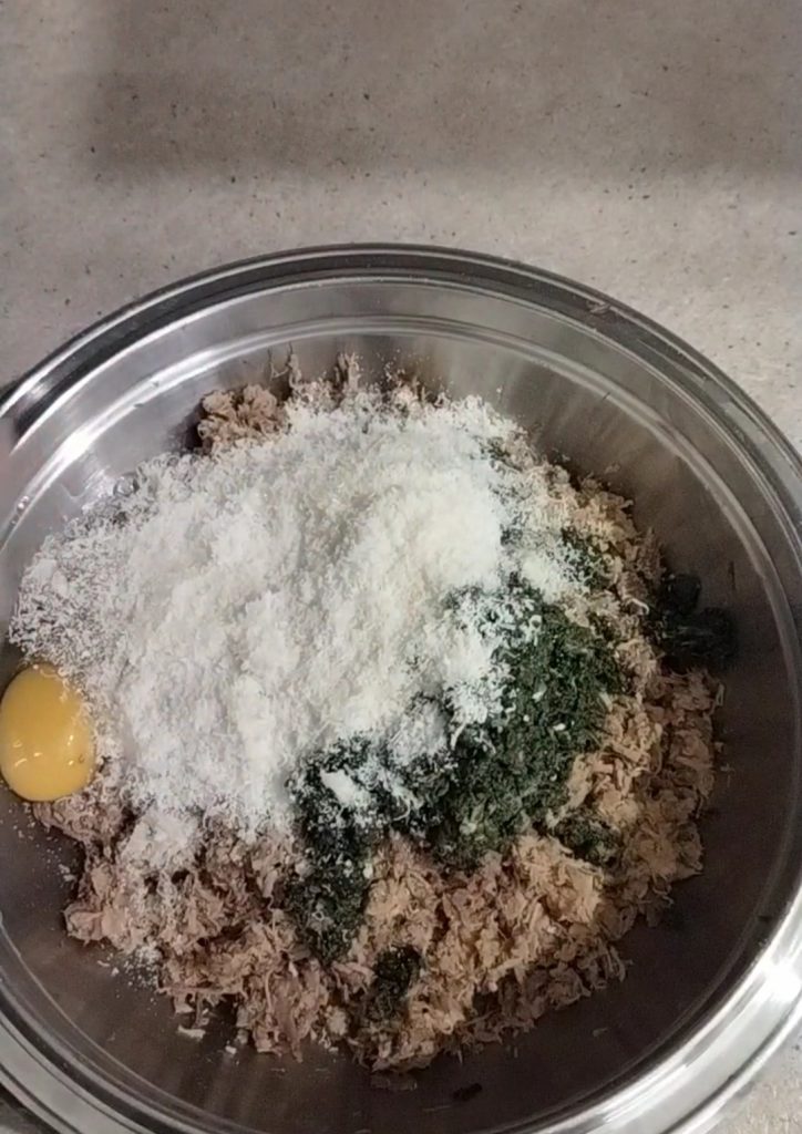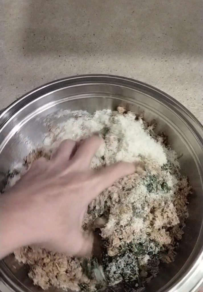 Voeg de eerder gebakken en fijngehakte spinazie toe, het ei, de Parmezaanse kaas, twee of drie eetlepels van de apart gehouden groenten.