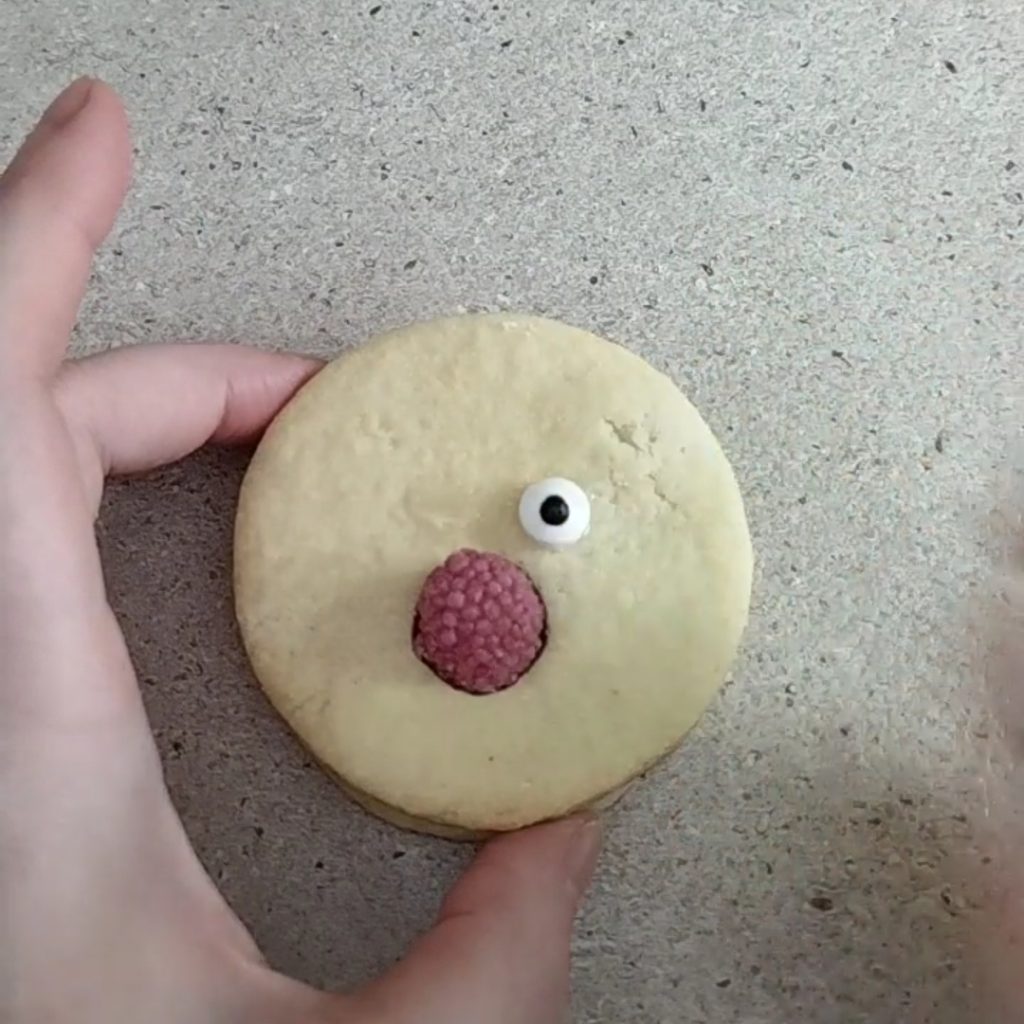 Versier de koekjes: maak de neus met een frambozen snoepje en plaats de suiker ogen vast met glucose siroop.