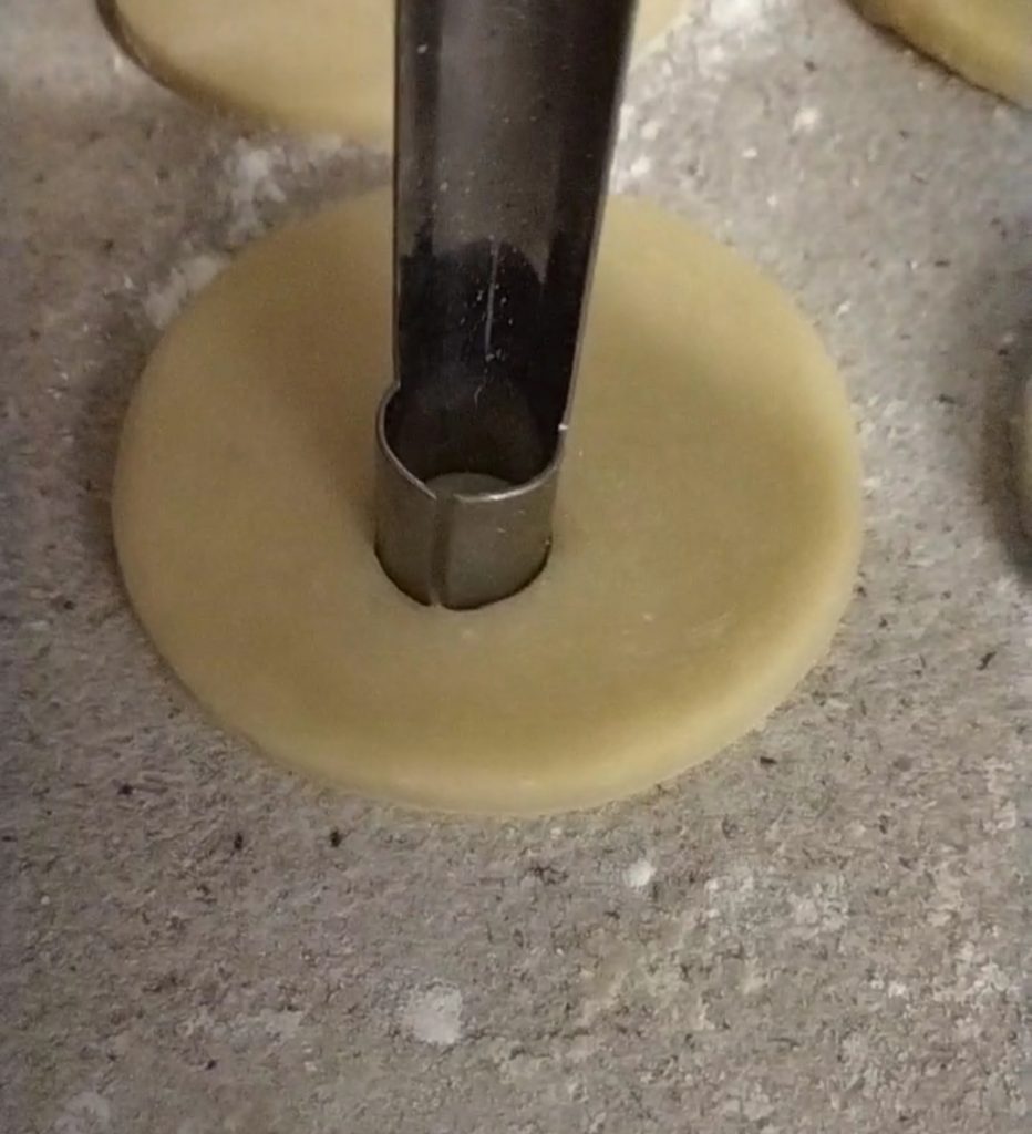 Maak bij de helft van de koekjes een klein cirkeltje iets onder het midden. Ik heb een appelboor gebruikt, ik vond dit een handige en eenvoudige methode. Laat de andere helft zoals ze zijn.