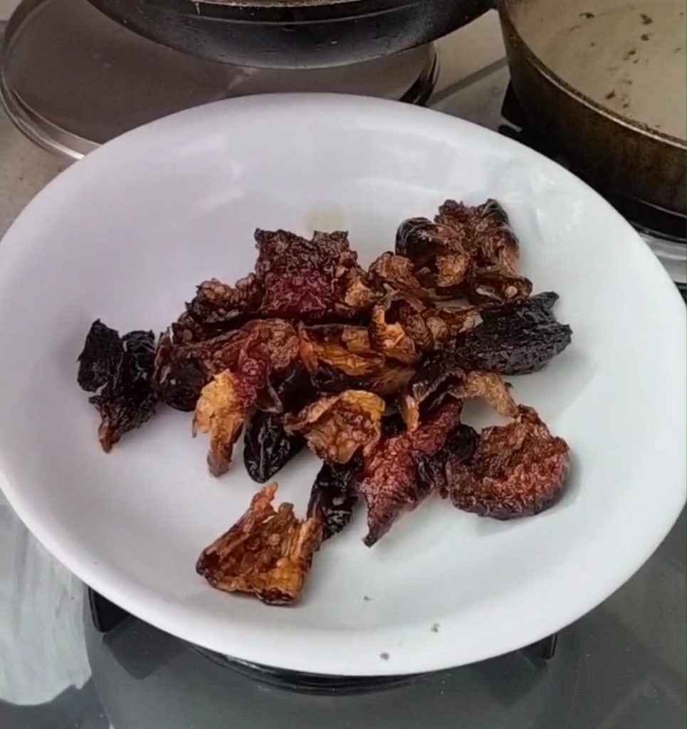 En nu is het tijd voor de verfijnde toets van het gerecht: de cruschi paprika’s. Je kunt ervoor kiezen om ze heel te frituren of ze lichtjes in stukken te snijden. Wij hebben voor de tweede optie gekozen.