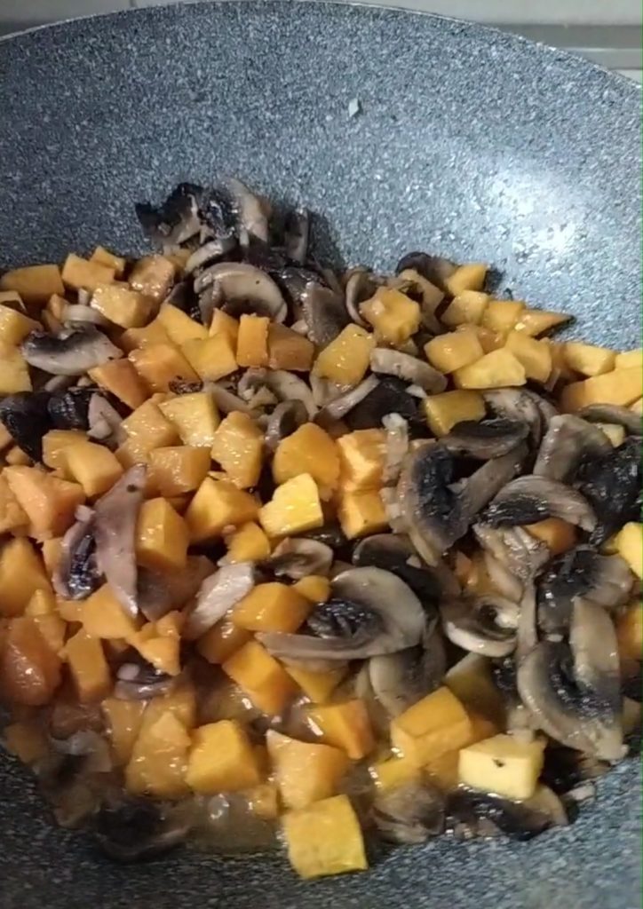 Doe twee eetlepels olijfolie, een teentje knoflook, de gehakte ui in een pan en laat dit alles op smaak komen. Voeg nu de pompoen en champignons toe en bak ze een paar minuten op middelhoog vuur.
