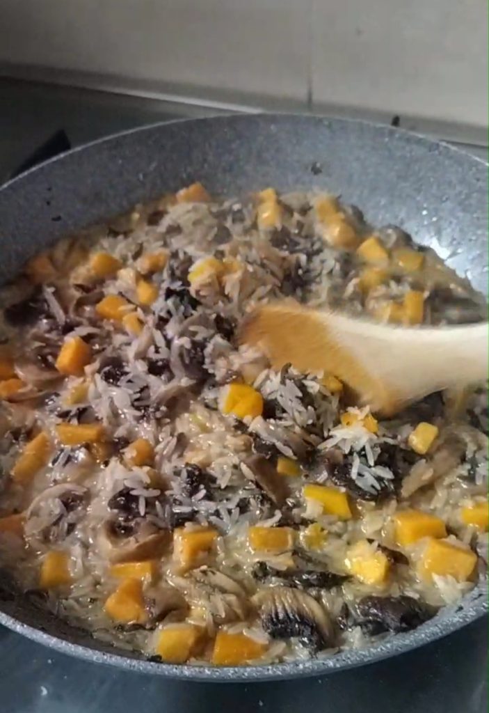 Een heel eenvoudig gerecht, met weinig ingrediënten, maar dat je zal verrassen met zijn bijzondere smaak. Ik heb champignons gebruikt, die een delicatere smaak hebben en de pompoen niet overheersen, maar als je van sterkere smaken houdt, kun je ook porcini gebruiken.