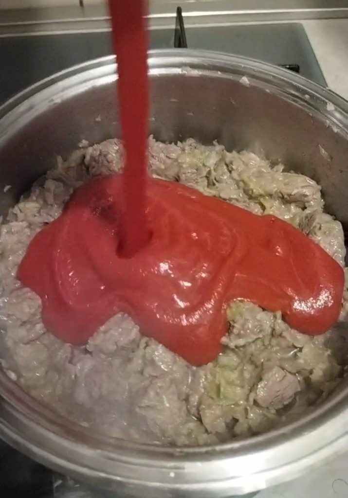 Voeg de passata di pomodoro toe, spoel de fles met water en voeg deze toe aan de pan.