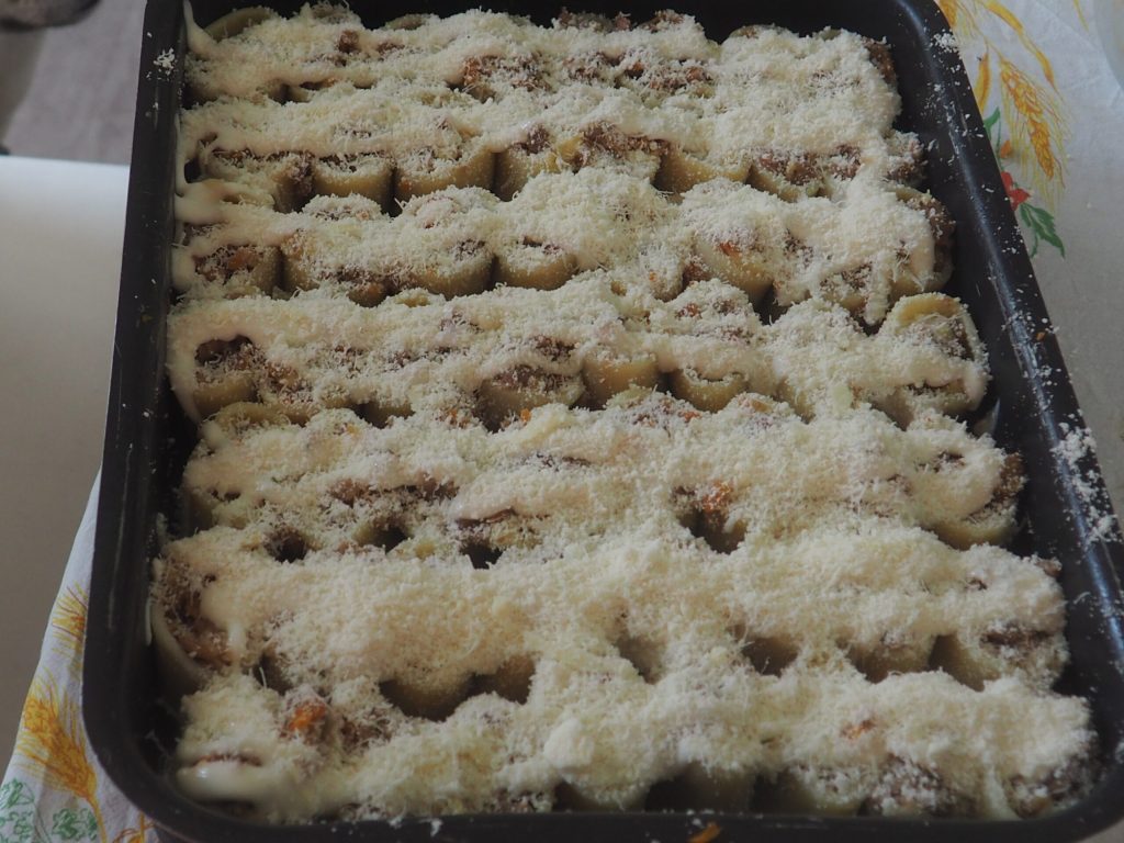 Kook de pasta al dente in ruim gezouten water, giet af. Leg een dunne laag bechamelsaus (klik voor het recept) in een ovenschaal en leg daarop de schiaffoni die je vult met het mengsel van vlees en scamorza. Ik heb een spuitzak zonder spuitmond gebruikt.