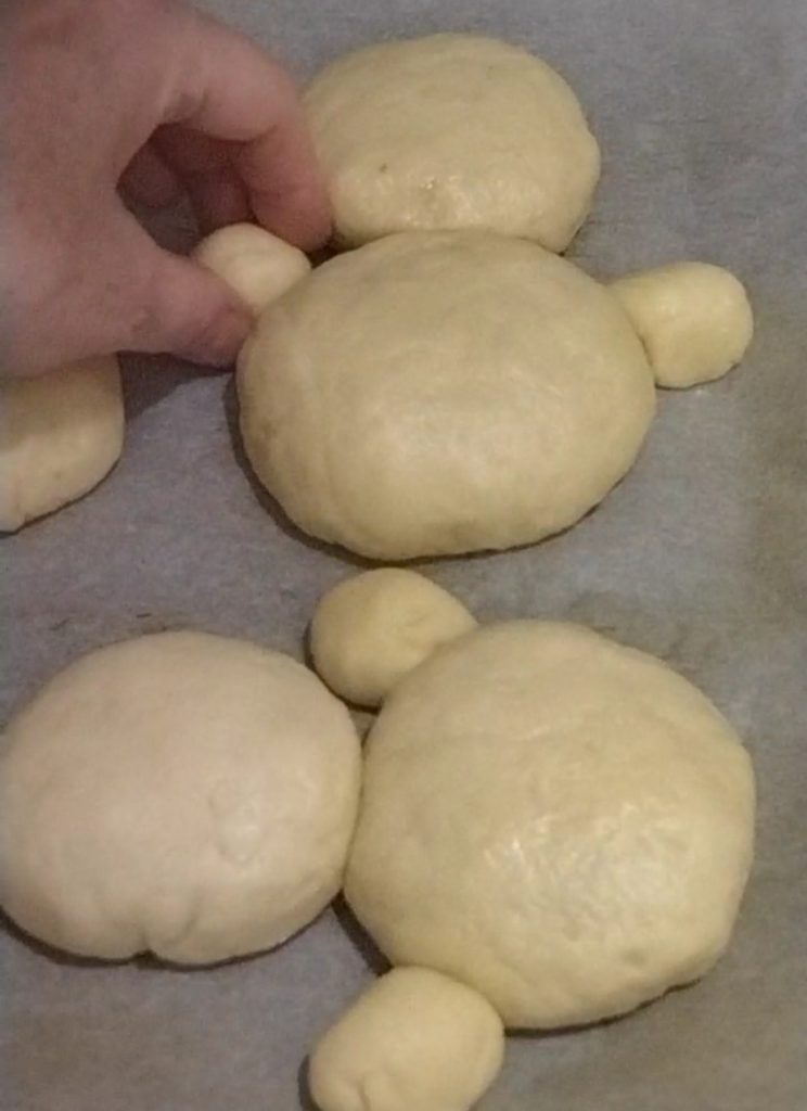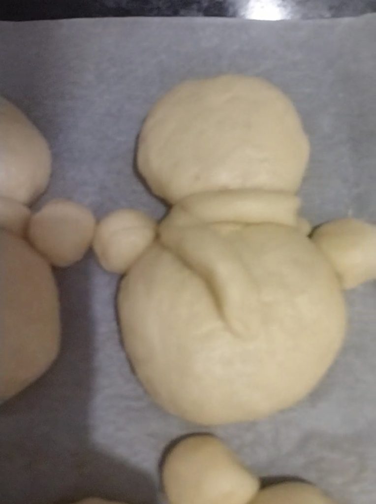 Na de tijd neemt u het gerezen deeg, legt u het op een met meel bestoven werkblad. Verdeel het in balletjes: van 60 g voor het hoofd, van 100 g voor het lichaam en van 10 g voor de armen en de sjaal. Met deze hoeveelheden krijgt u 5 sneeuwpoppen. Rol met de handen of met een deegroller de balletjes uit voor het hoofd en het lichaam, vul ze met twee theelepels jam. Zorg ervoor dat u een dikke jam gebruikt, anders loopt het risico eruit te komen tijdens het bakken.