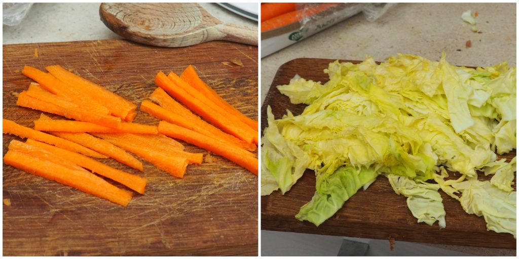 Maak de kool schoon, verwijder de harde delen, was het en snijd het in reepjes.
