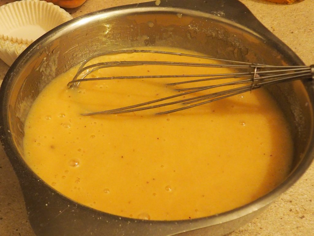 • Plaats de muffinvormpjes op een bakplaat en vul ze ongeveer voor de helft. Als je vormpjes van 3,5 cm (hoogte) en 6,5 cm (diameter) gebruikt, krijg je er 16/17. Ik kreeg er 12, maar ik gebruikte vormpjes van verschillende afmetingen.