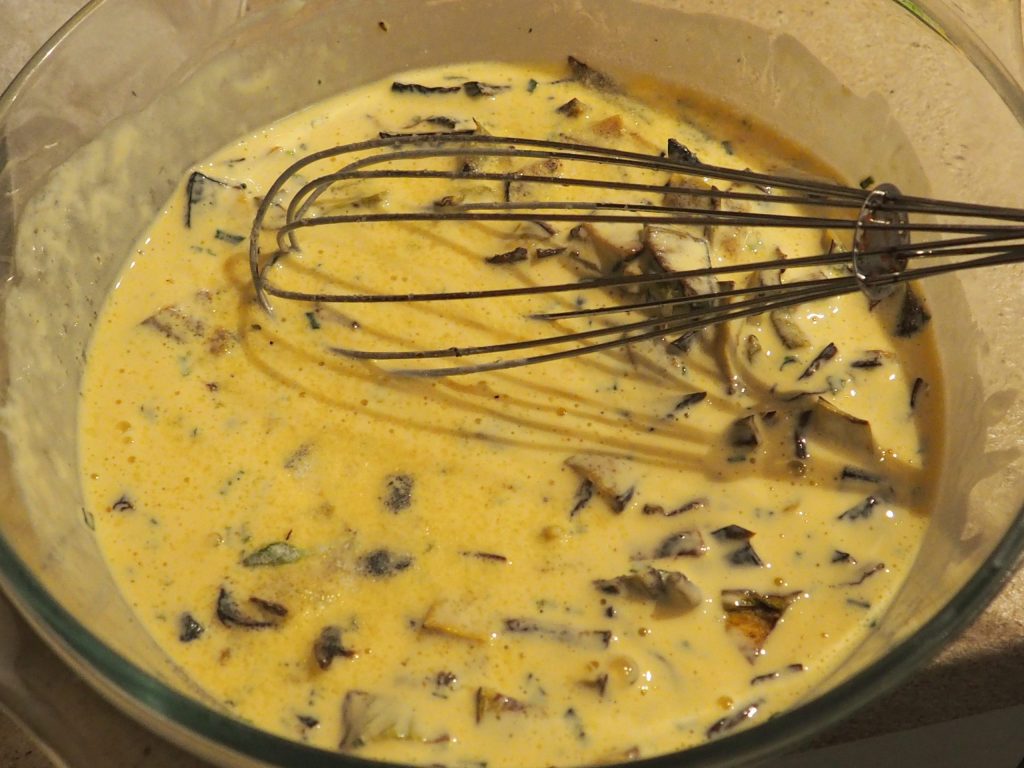 Doe in een kom de eieren, de room, de bieslook, de in stukjes gesneden gegrilde courgettes en het zout en meng met een garde.