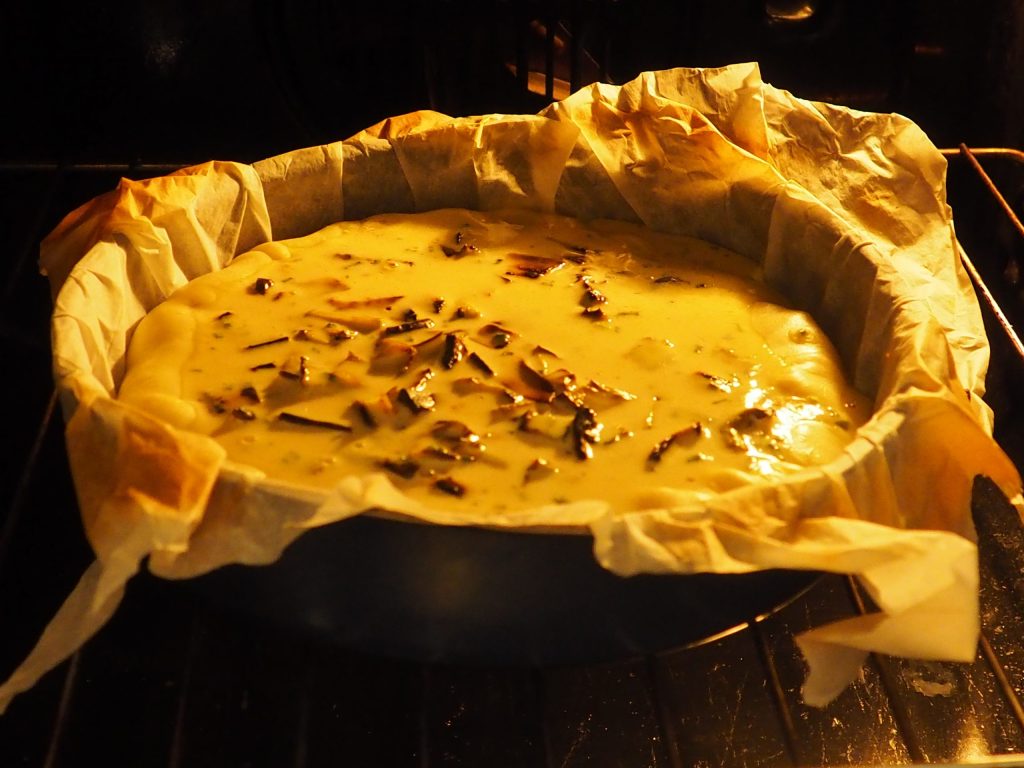 Leg het bladerdeeg in een bakvorm met een diameter van 24 cm en giet het ei-mengsel erin.