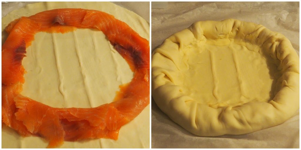 Leg de plakjes gerookte zalm rondom en sluit het bladerdeeg goed af.