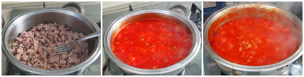 Voeg nu de tomatenpulp toe, breng op smaak met zout en laat ongeveer een half uur koken.