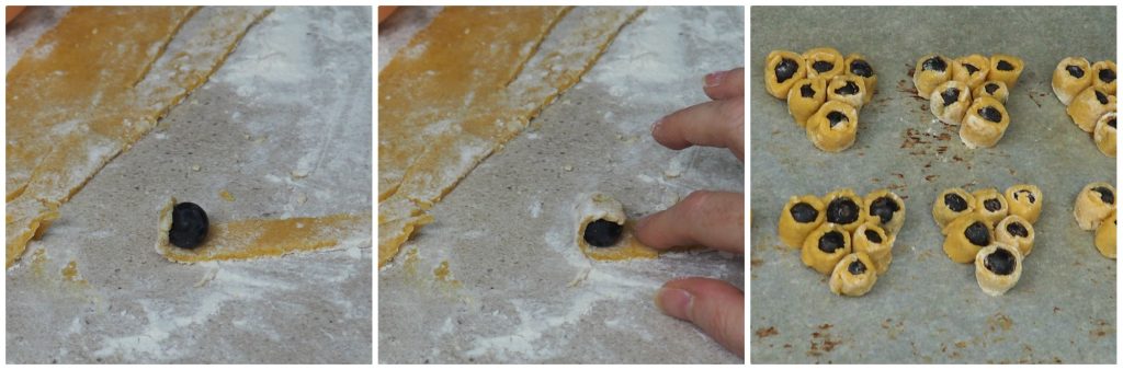 Haal de druiven van de tros, bevochtig ze lichtjes (zodat ze beter hechten aan het zanddeeg), rol ze een voor een in de stroken en sluit ze door de rand lichtjes nat te maken.