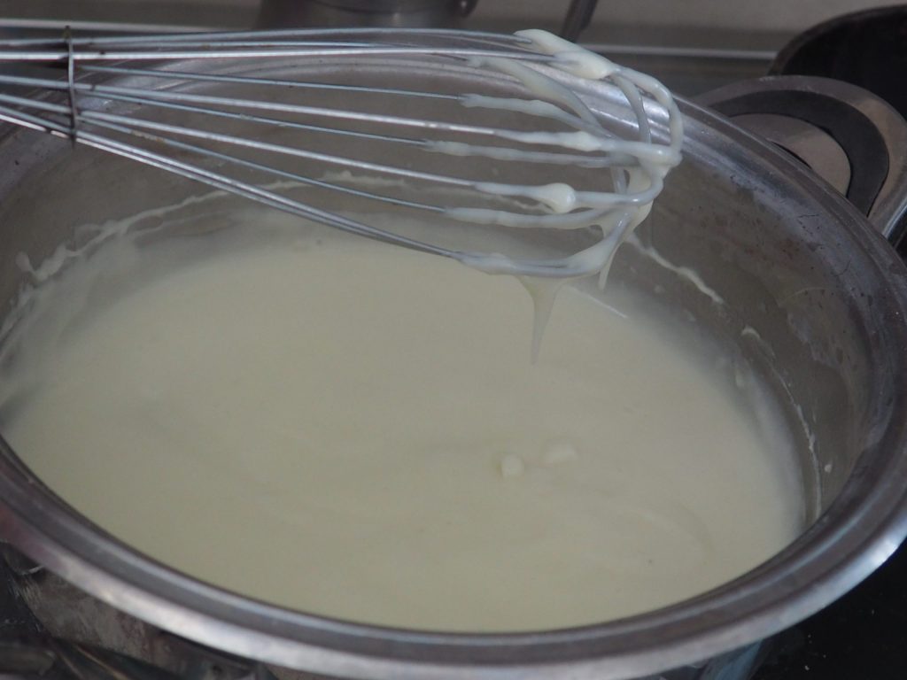Laat koken tot het ingedikt is, blijf roeren met een garde om klontjes te voorkomen.