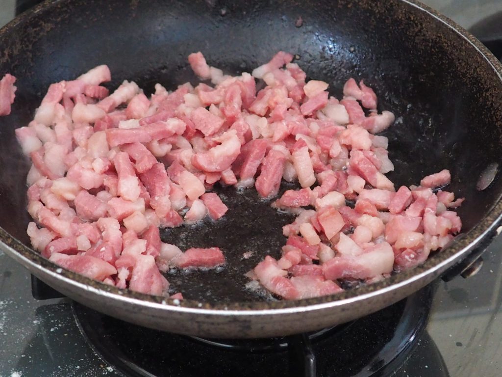 Bak ondertussen de spekblokjes in een koekenpan een paar minuten.