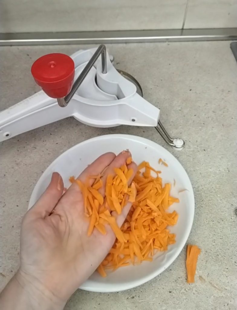 Was en schil ondertussen de wortelen. Snijd ze in dunne lucifers, ik heb een oud apparaatje gebruikt dat ik thuis had, maar je kunt het ook gewoon met een mes doen.