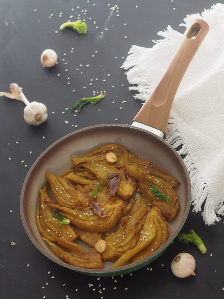 De venkel in de pan met ansjovis is een zeer smaakvol gerecht, en om het nog lekkerder te maken heb ik een paar teentjes knoflook en een beetje kurkuma toegevoegd (die je natuurlijk kunt weglaten als je het niet lekker vindt).