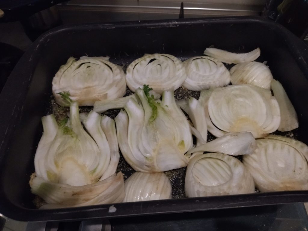 Was de venkel en snijd ze in plakjes van ongeveer 1,5 cm dik. Vet een rechthoekige ovenschaal van 31×24 cm in met wat olie en bestrooi met paneermeel, leg dan de venkelplakjes erop.