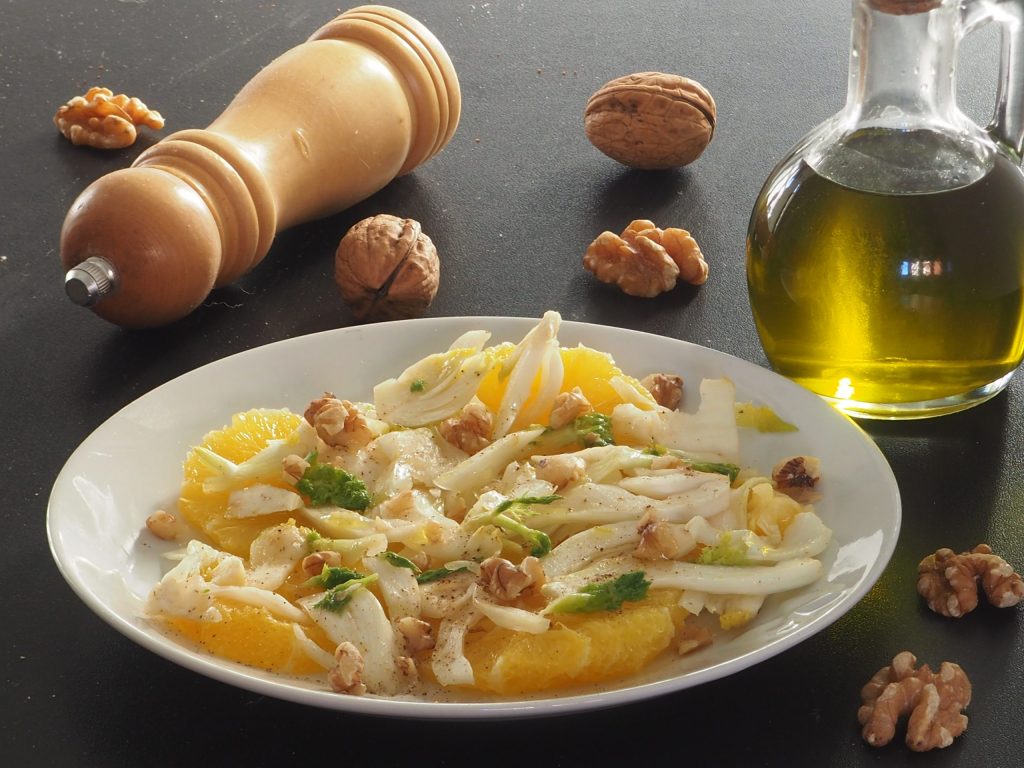 Doe de venkels en sinaasappels in een kom en breng op smaak met een beetje olie, wat peper en zout. Voeg daarna de walnoten in stukjes toe.