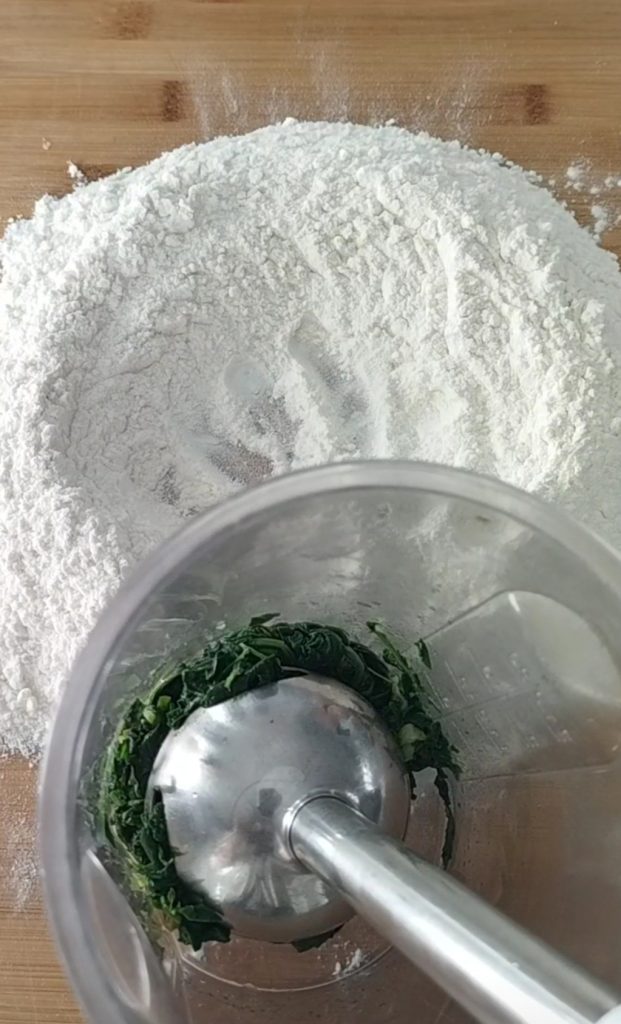Maak een bergje van de bloem op een werkblad, begin met 300 gr. bloem, voeg meer toe als het deeg te zacht is. Voeg de eieren, de gezeefde spinazie en twee snufjes zout toe.