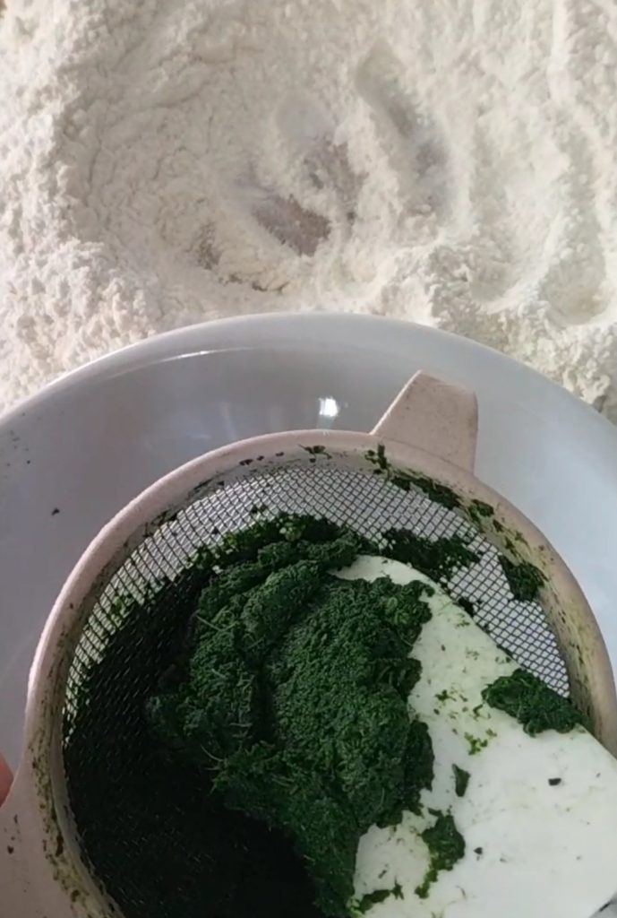 Kneed het goed door, als het deeg te zacht is, voeg dan nog wat bloem toe, als het te hard is, voeg dan beetje bij beetje een beetje water toe. Het hangt allemaal af van hoeveel water de spinazie bevatte.