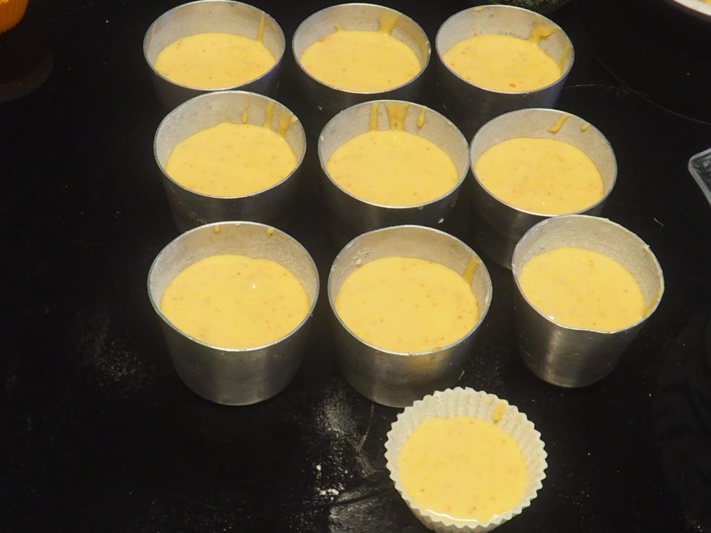 Vet de vormpjes in en bestuif ze met bloem (de mijne zijn 5,5 cm hoog en 7,5 cm in diameter), vul ze iets meer dan halfvol, je krijgt er 9-10.