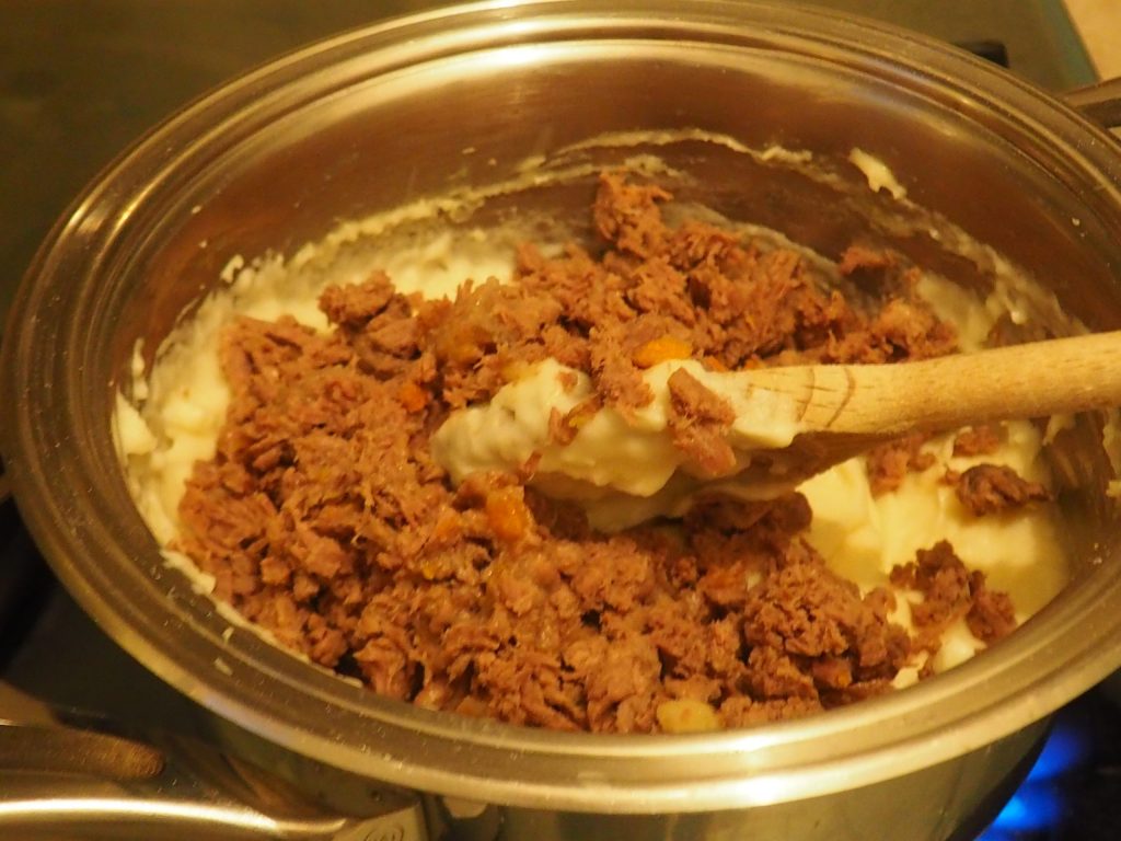 Laat de bechamelsaus iets afkoelen, voeg dan het vlees, de peterselie en het ei toe en meng goed.