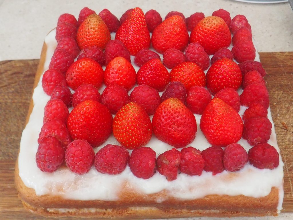 Zacht en heerlijk, deze zachte taart met rode vruchten gevuld met melkroom is werkelijk een traktatie. Je kunt hem decoreren met seizoensfruit naar eigen smaak, ik heb frambozen, aardbeien en kersen gebruikt als eerbetoon aan de komende zomer.