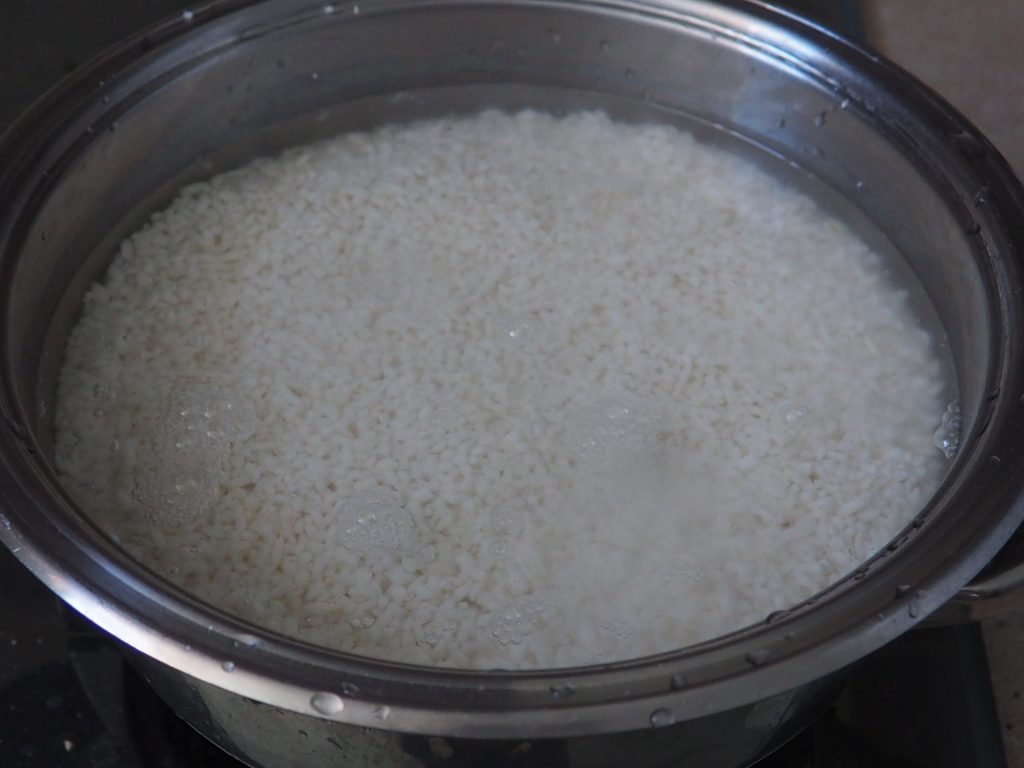 Nu zet je de gewassen rijst in een pan en vul je het met water (je hebt ongeveer 700 ml nodig), voeg het grove zout toe en kook het op een laag vuur met de pan bedekt.