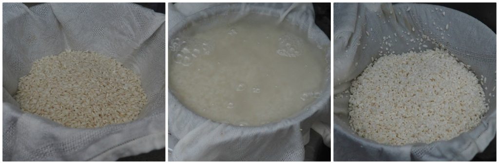 Doe de rijst in een vergiet bedekt met een doek met vrij grote mazen en spoel het af met koud water, wrijf het ook met je handen, ververs het water meerdere keren totdat het helder is. Als u wilt, kunt u ook een zeef gebruiken.