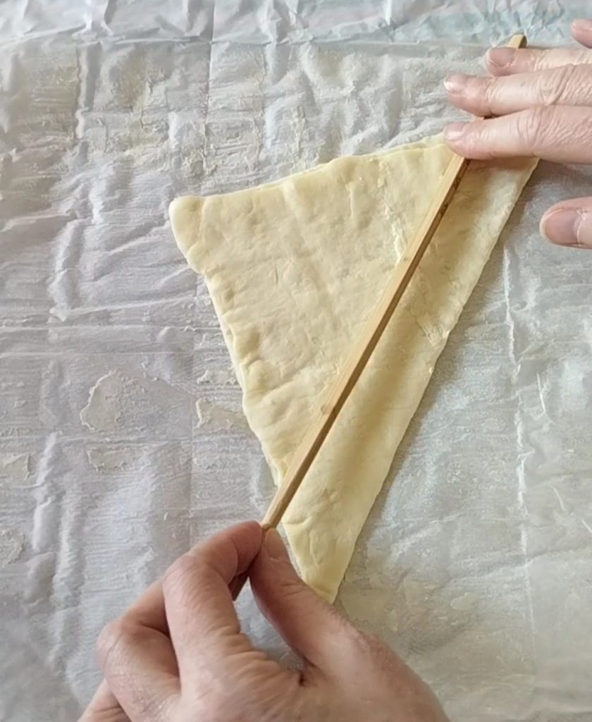 • Druk goed aan door het bladerdeeg langs de diagonaal met een stokje dicht te vouwen.