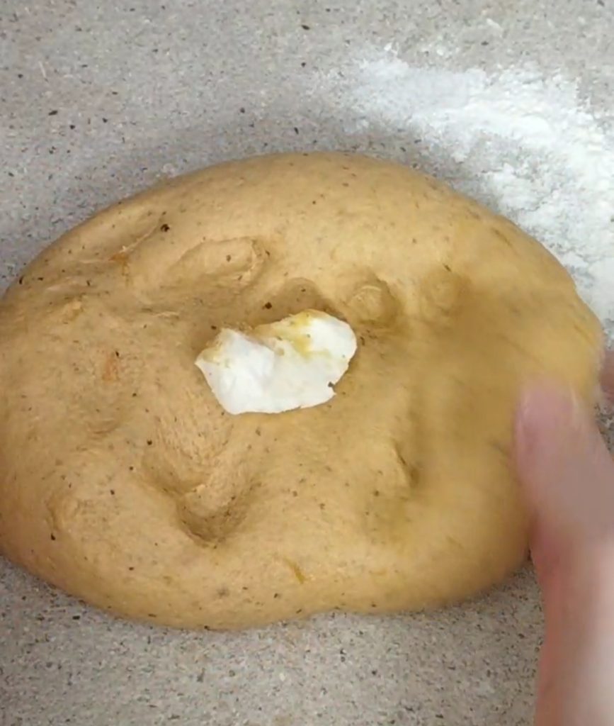 Leg op een werkblad de Manitobabloem, de bloem 00, de eerder fijngehakte noten met de suiker, de tot puree verwerkte pompoen, het ei, het gistmengsel en ongeveer de helft van de boter in een hoop.