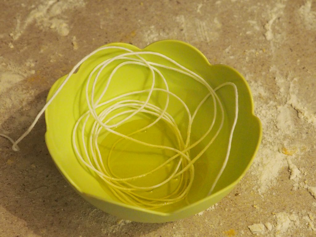 Knip ongeveer 50 cm touw en begin het deeg te binden zoals op de foto’s.