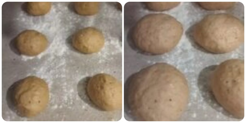 Haal het deeg uit de kom, verdeel het in ongeveer tien balletjes van elk ongeveer 65 gram. Leg ze op een met bloem bestoven werkblad en laat ze nog ongeveer een uur rijzen, ze moeten in volume verdubbelen.
