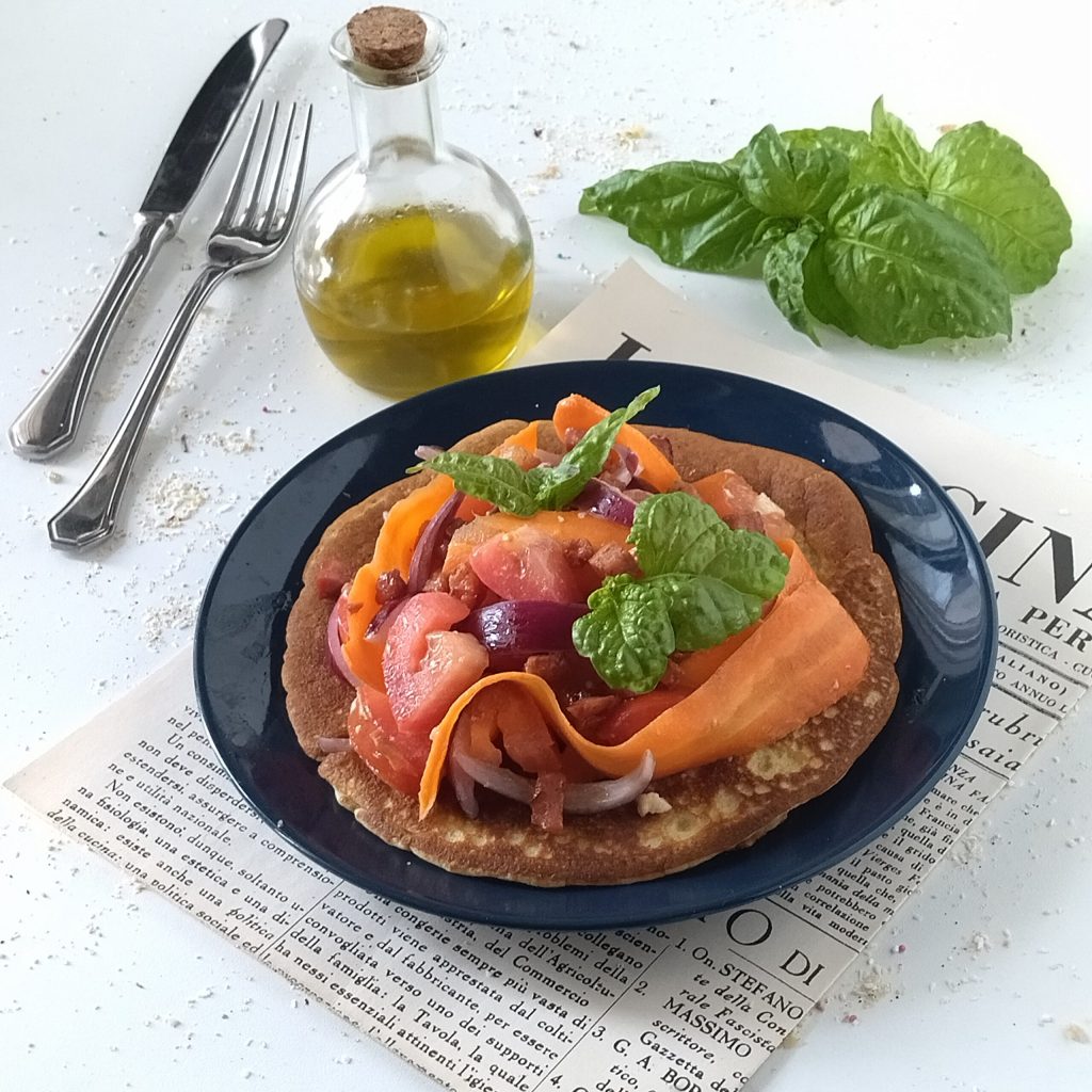 Plaats een deel van de topping op elke pannenkoek, garneer met basilicumblaadjes en serveer. Als je wilt, kun je de bovenkant van de pannenkoek bedekken met smeerkaas, dit maakt je gerecht nog romiger.