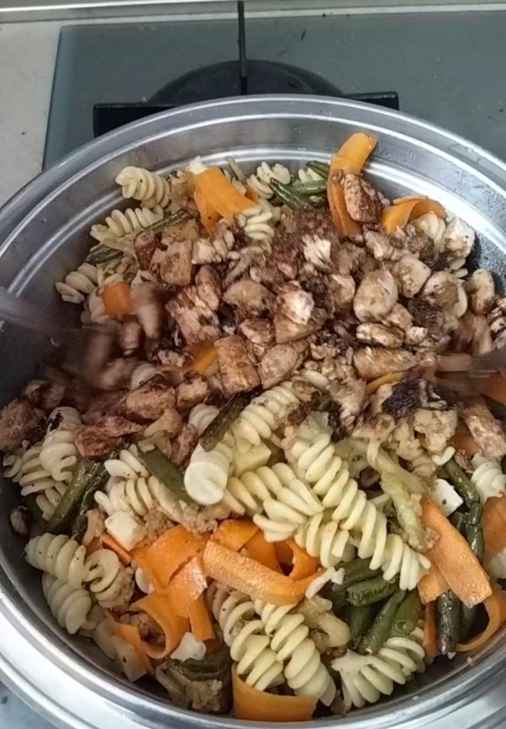 Doe nu alle ingrediënten bij elkaar. Doe de inmiddels afgekoelde pasta, de wortelen, de kaas in een grote kom en meng alles.
