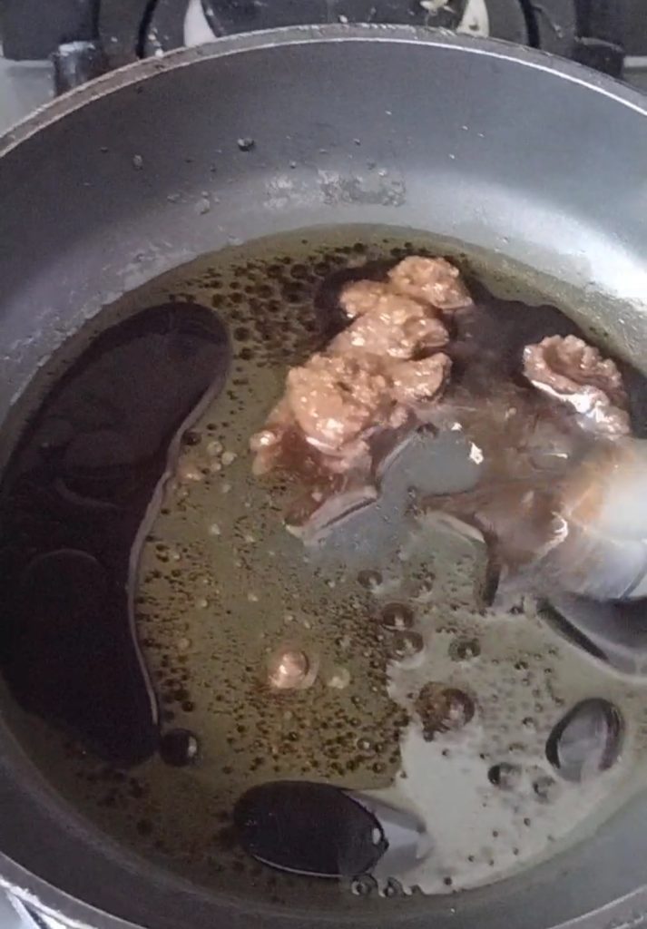 Zet het vuur hoog en bak de tofu goudbruin. Haal het uit de pan en leg het op een bord. Voeg nu dezelfde hoeveelheden van de saus als eerder toe aan de pan en bak de resterende tofu.