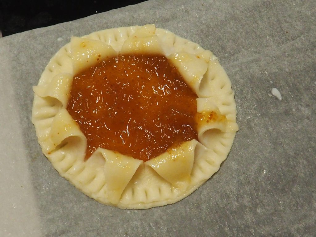 Rol het bladerdeeg uit op bakpapier, snijd een cirkel uit met een koekjesvorm van 10 cm, leg er een flinke theelepel jam op. Bestrijk de randen met een beetje melk.