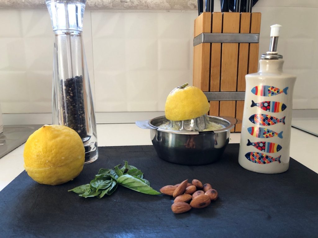 Zet het water op het vuur en bereid ondertussen de saus. In een zeer hete pan roosteren we de amandelen zodat ze hun essentiële oliën vrijgeven. In de blenderkom gieten we het sap van twee citroenen, de geroosterde amandelen, het grove zout en de extra vergine olijfolie. Voeg de basilicumblaadjes toe en mix tot een crème. Kook ondertussen de linguine. Hak wat amandelen en basilicumblaadjes fijn met een mes en zet ze apart. Wanneer de spaghetti gaar is, doe ze in een kom met een beetje kookwater, voeg de pesto toe die we hebben gemaakt en meng snel, naar smaak een snufje peper en serveer. Garneer met de fijngehakte basilicum en amandelen en serveer.