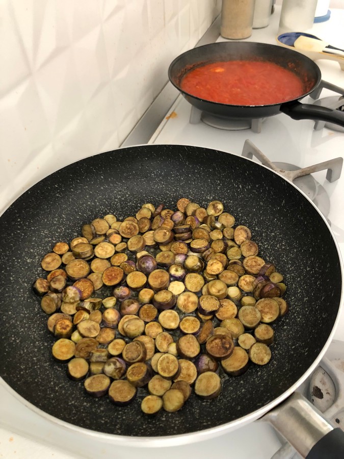• Bereid de aubergines voor door ze in ringen te snijden, zodra ze gesneden zijn, leg ze in een koekenpan met 4-5 eetlepels olijfolie en laat ze op laag vuur bakken. Ondertussen, in een andere pan, doe 3 eetlepels olijfolie en de knoflookteen, zodra de knoflook begint te sissen, voeg de tomaten toe (pureer ze eerst met een staafmixer). Ik gebruik zelfgemaakte conserven en pureer ze in de pot zelf met de staafmixer.